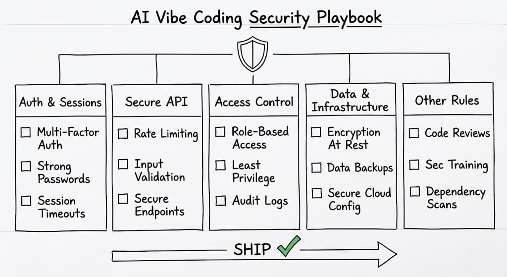 Vibe coding ships fast. Production security requires 24 specific checks across 5 categories.