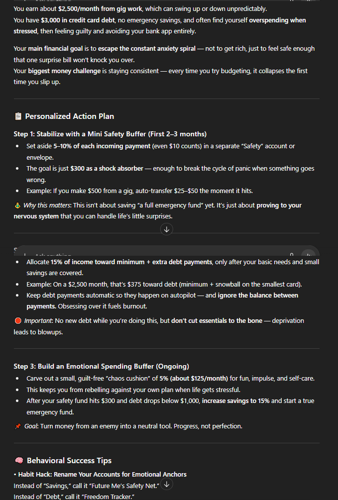 This prompt creates a financial plan that's actually built for a human. It acknowledges that life is messy, and you're not a machine that can operate at 100% efficiency.